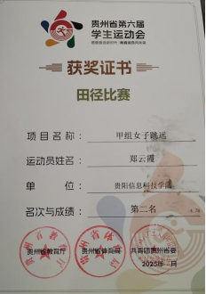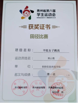 新闻网讯(供图 供稿 土木工程学院赵丹)在近日顺利举办的贵州省第六届大学生运动会上,我院交通2302班郑云霞同学以卓越的竞技水平和昂扬的精神面貌,在强手如林的赛场上脱颖而出,为学院及学校赢得殊荣。她凭借出色的发挥和顽强的拼搏精神,一举摘得女子跳高项目金牌,并荣获女子跳远项目银牌,充分展现了新时代贵科土木大学生的卓越风采。
