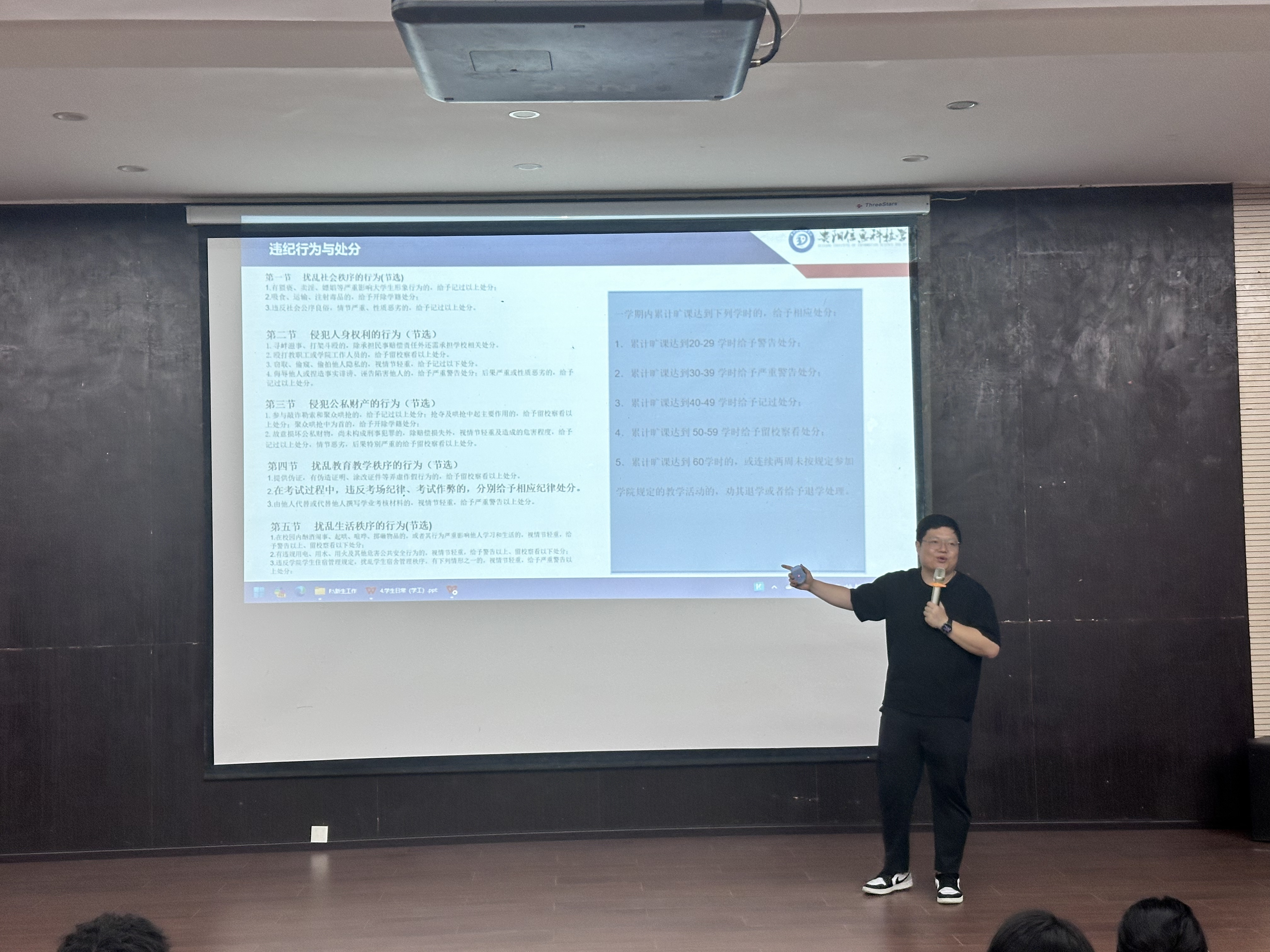 学业是大学的核心,规划是成长的前提。在随后的学业指导环节,学工办主任郭东越老师围绕《学生日常(学工)》《yabo鸭脖官网全日制本科生学士学位授予实施办法》等内容展开专题讲解。他从学生日常管理规范、严格的学业考核要求,到清晰的学士学位授予条件,逐一为新生们厘清大学学业的“边界”与“路径”,让新生们明确了大学学习的目标与方向,为后续投入专业学习做好了充分的认知准备。