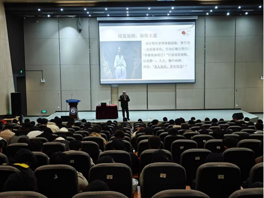 黄晓儒书记以《立大志、担大任:王阳明心学智慧“龙冈四规”》为题,围绕王阳明“立志为圣、知行合一”的人生轨迹,讲述王阳明在贵州龙场悟道提出“心即理”“致良知”思想的过程,揭示了阳明心学的深刻内涵。结合当代大学生成长实际,黄书记深入阐释了“立志、勤学、改过、责善”四大精神,即“龙冈四规”的核心。他以幽默而深刻的语言,勉励同学们珍惜大学时光,树立明确目标,养成自律、克制与独立思考的能力。他回顾了王阳明在贵州讲学、创办书院三十余所,推动贵州文化启蒙的历史,指出“知行合一”已成为贵州人文精神的重要标识,鼓励学生将学习、做人、做事融为一体。