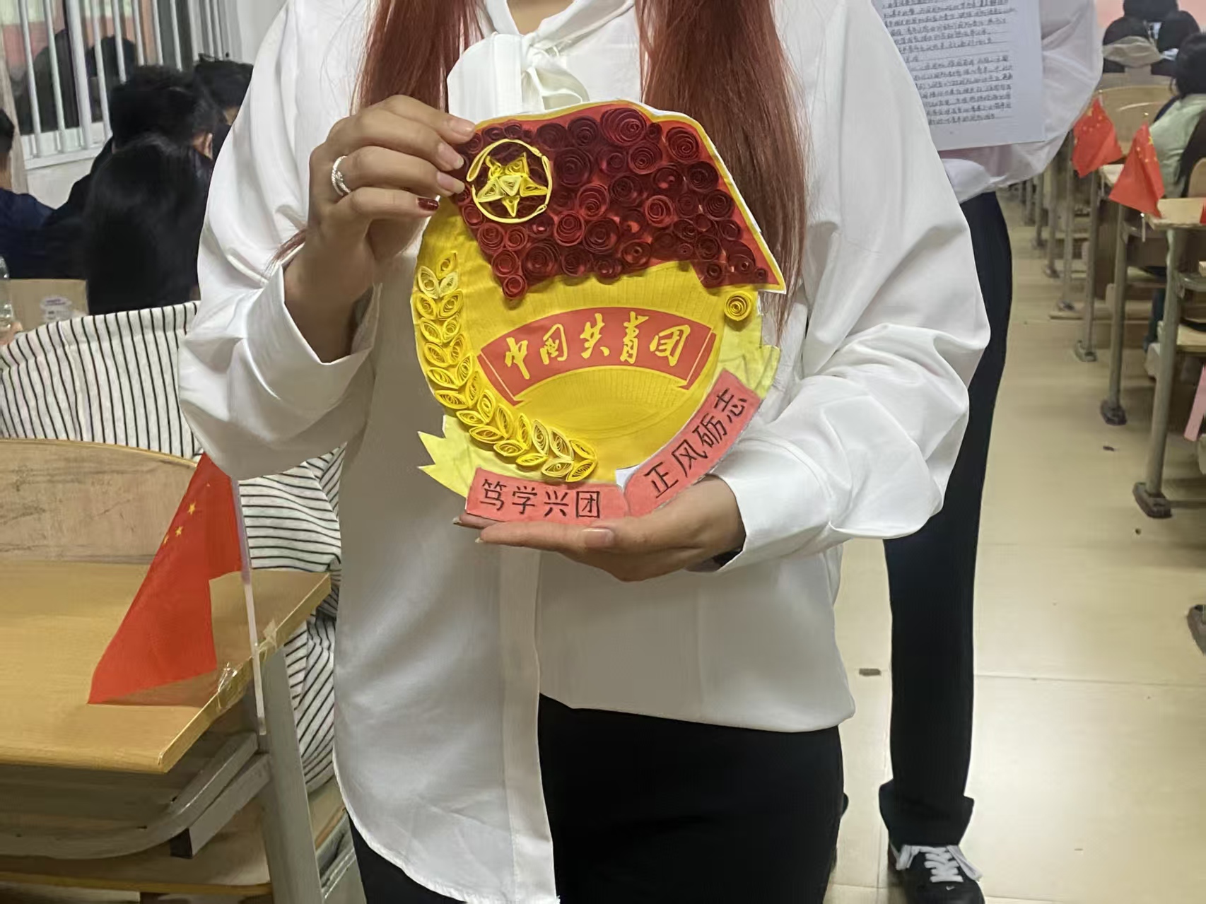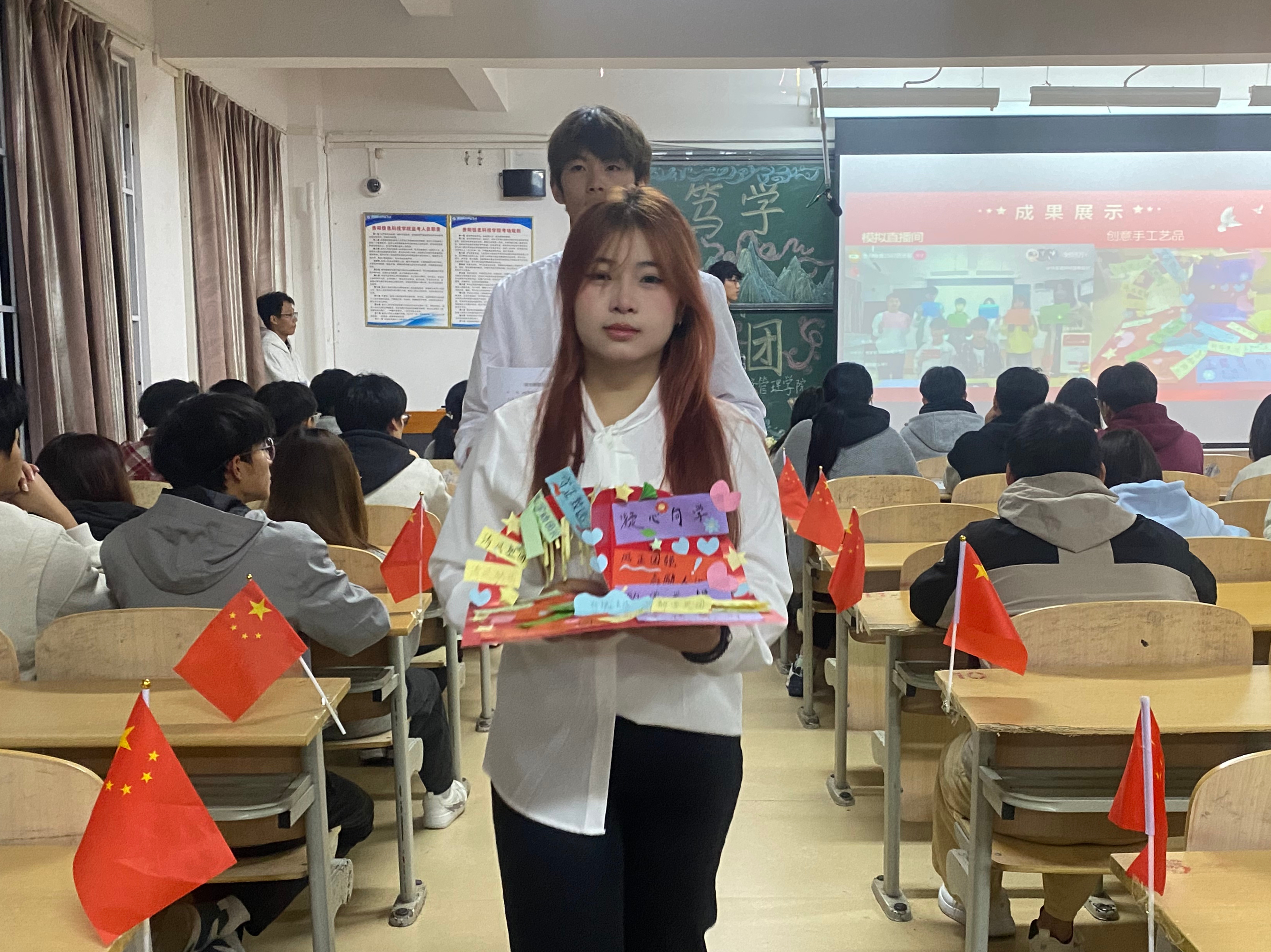 各班级展示环节亮点频出,尽显青春创意。电商2502班将主题活动的现场搬上“云端”;市场2501班与人资2401班让团的精神在指尖流淌,化作精美的剪纸与手工作品;而工商2502班与财管2501班则用落叶和纸壳这类寻常材料,将家国情怀与书香理念构筑得立体可观,创意与思想在动手中共同升华。