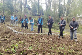 在青山环抱、碧水相邻的车田村田间地头,师生们迅速投入劳动实践:有的挥锹翻整土地,有的用白灰在田间勾勒出巨型“车田”字样,还有的分工协作播撒菜种。蓝白相间的志愿马甲与田野交织成景,青春的身影与乡村风光相映成趣,洋溢着蓬勃的生命力。