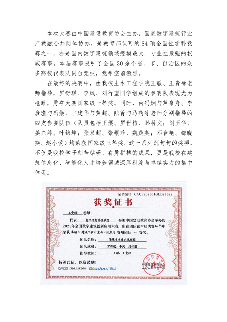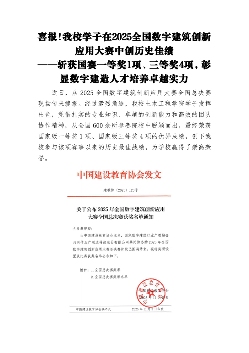 喜报!鸭脖学子在2025全国数字建筑创新应用大赛中创历史佳绩 ——斩获国赛一等奖1项、三等奖4项,彰显数字建造人才培养卓越实力