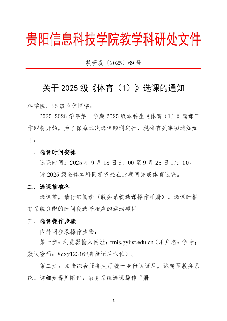 关于2025级体育(1)选课的通知