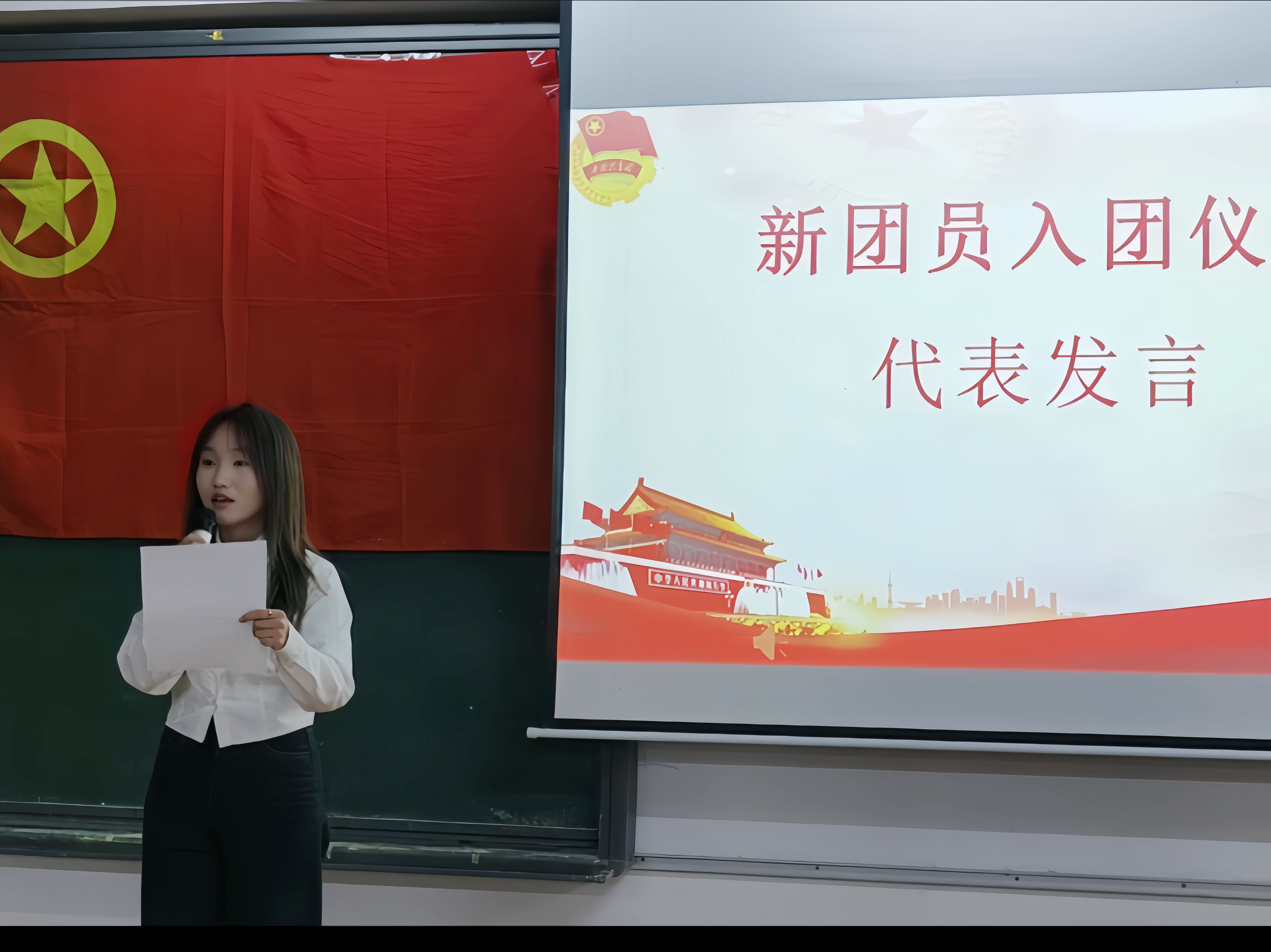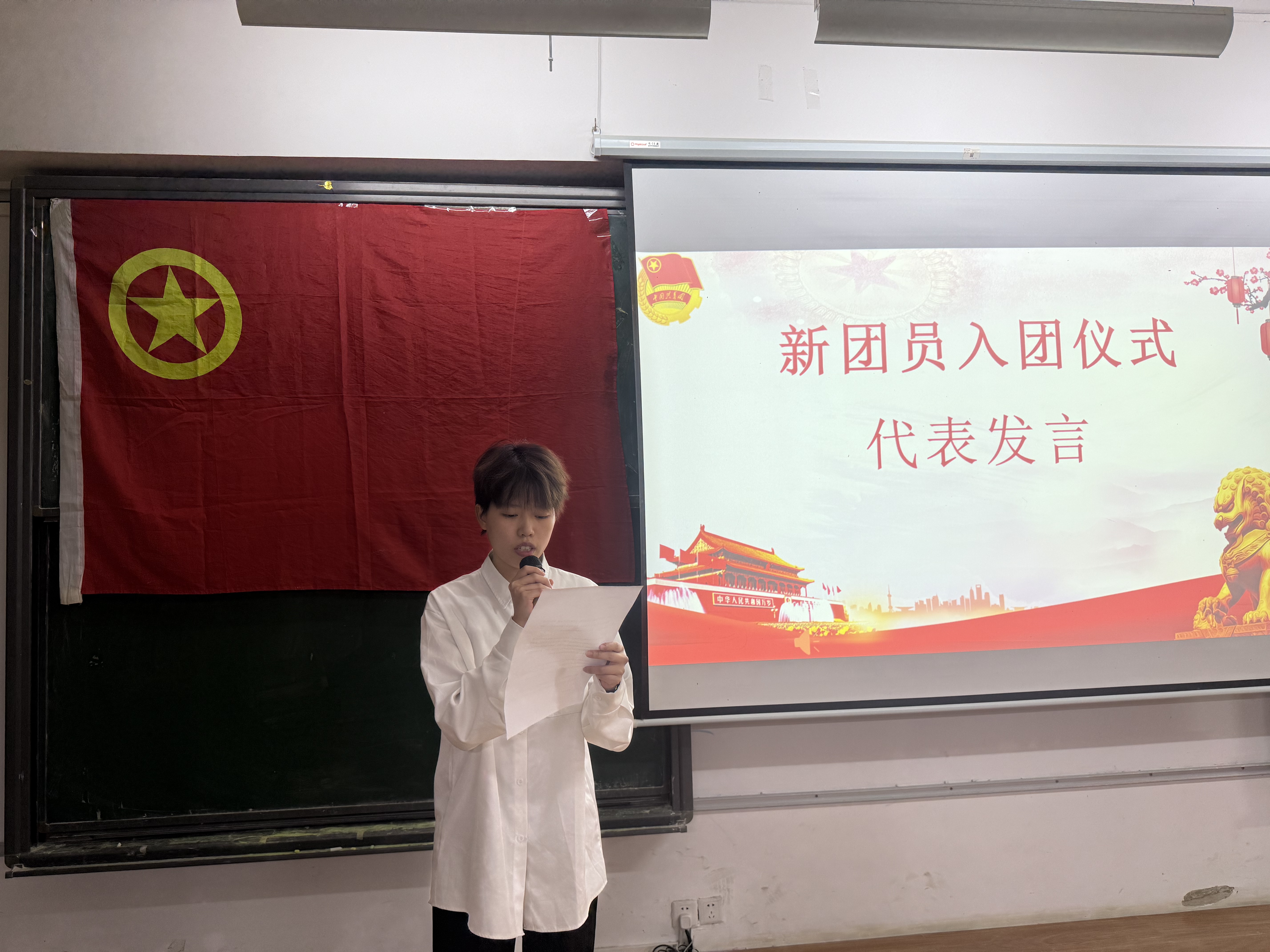 入团仪式在庄严的国歌声中正式开启。在现场庄重肃穆的氛围里,主持人宣读了36名新团员的名单,随后由老团员为新团员佩戴团徽。紧接着,全体团员面向团旗庄严宣誓,同学们的誓词铿锵有力,这是他们对信仰许下的坚定承诺。宣誓结束后,全体人员起身,齐声高唱团歌,“我们是五月的花海……”那熟悉的旋律,点燃了在场每一位共青团员的青春热情。