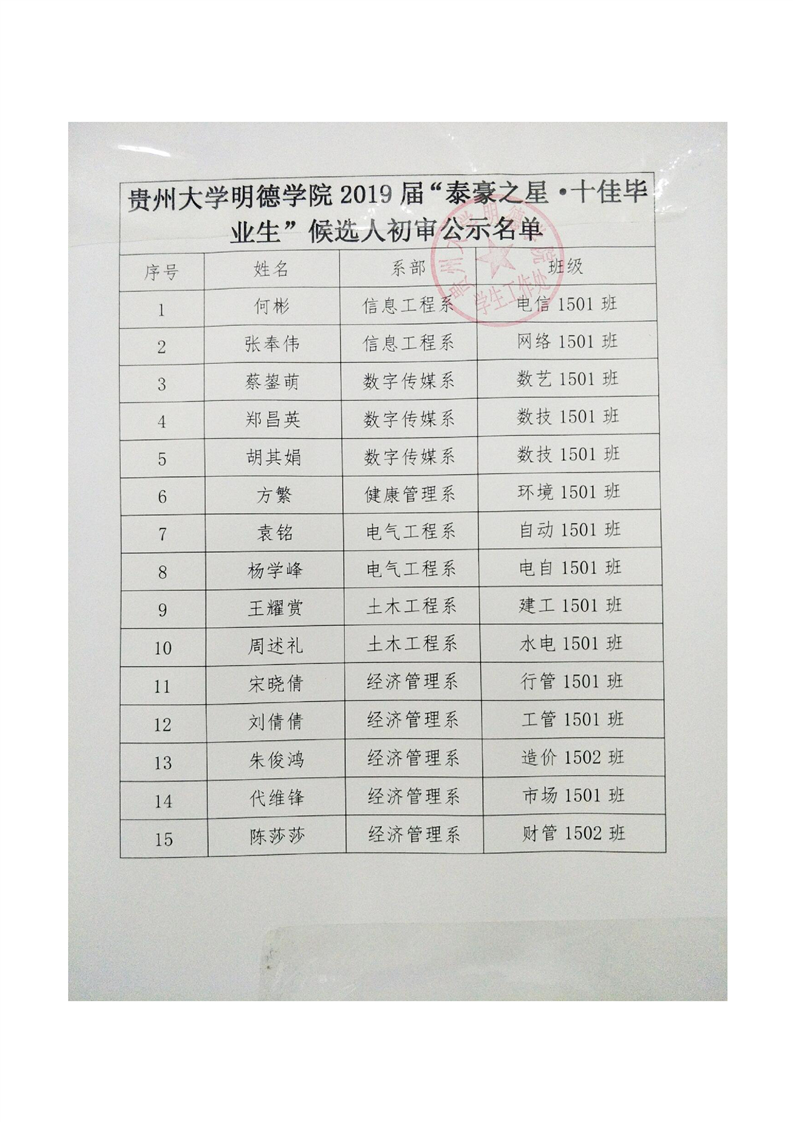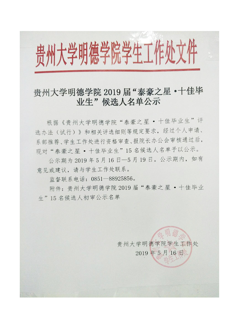 贵州大学明德学院2019届“泰豪之星·十佳毕业生”候选人名单公示