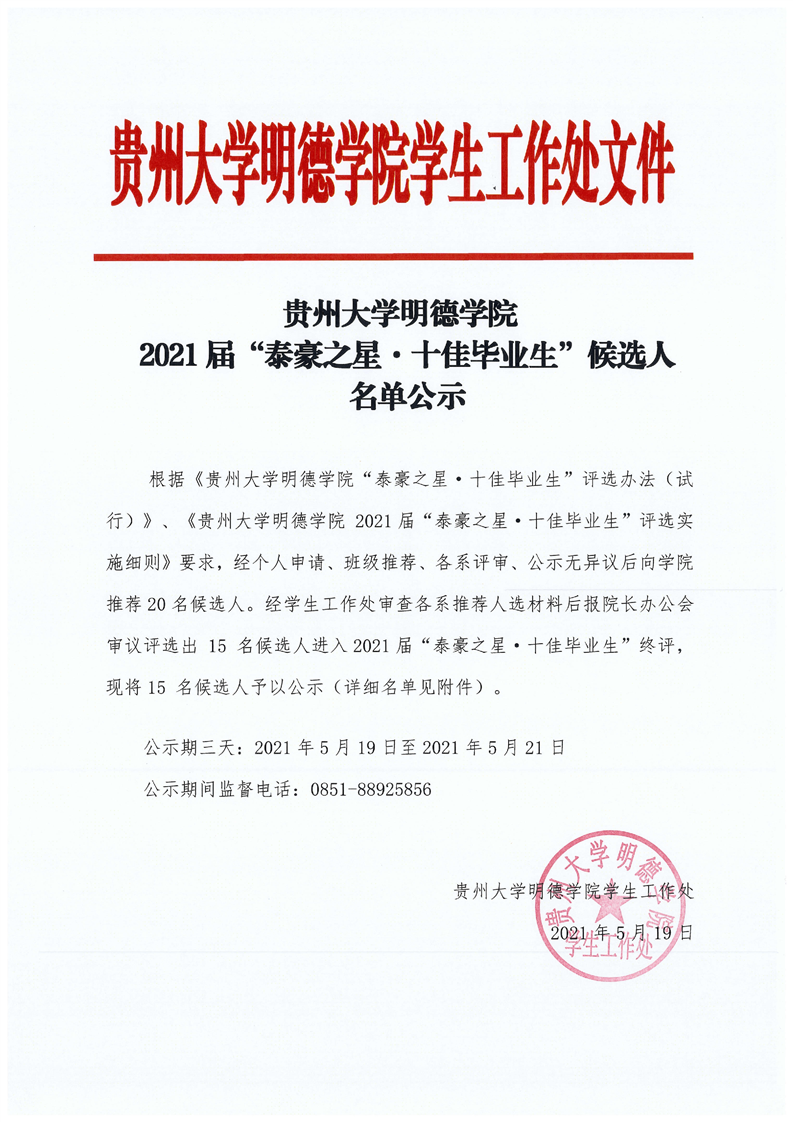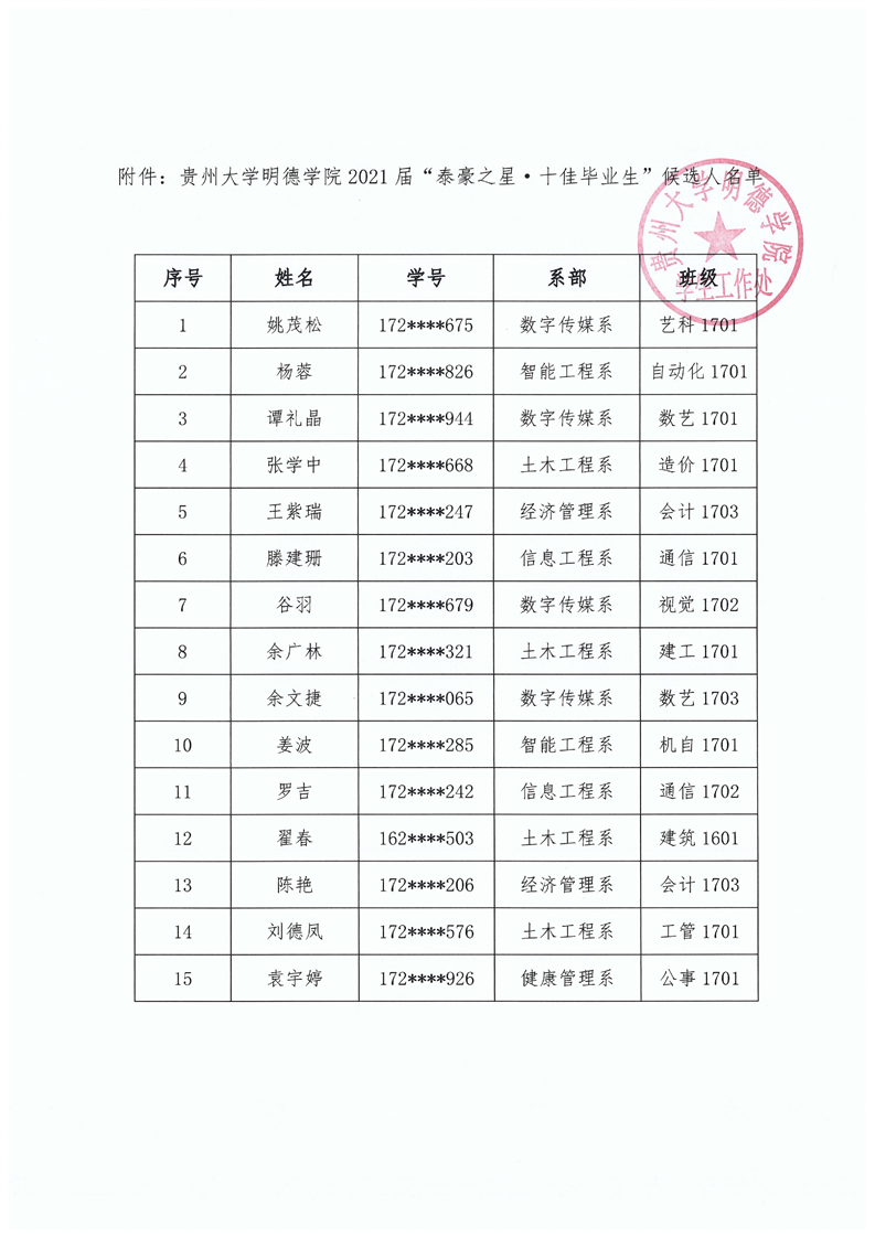 贵州大学明德学院2021届“泰豪之星·十佳毕业生”候选人名单公示