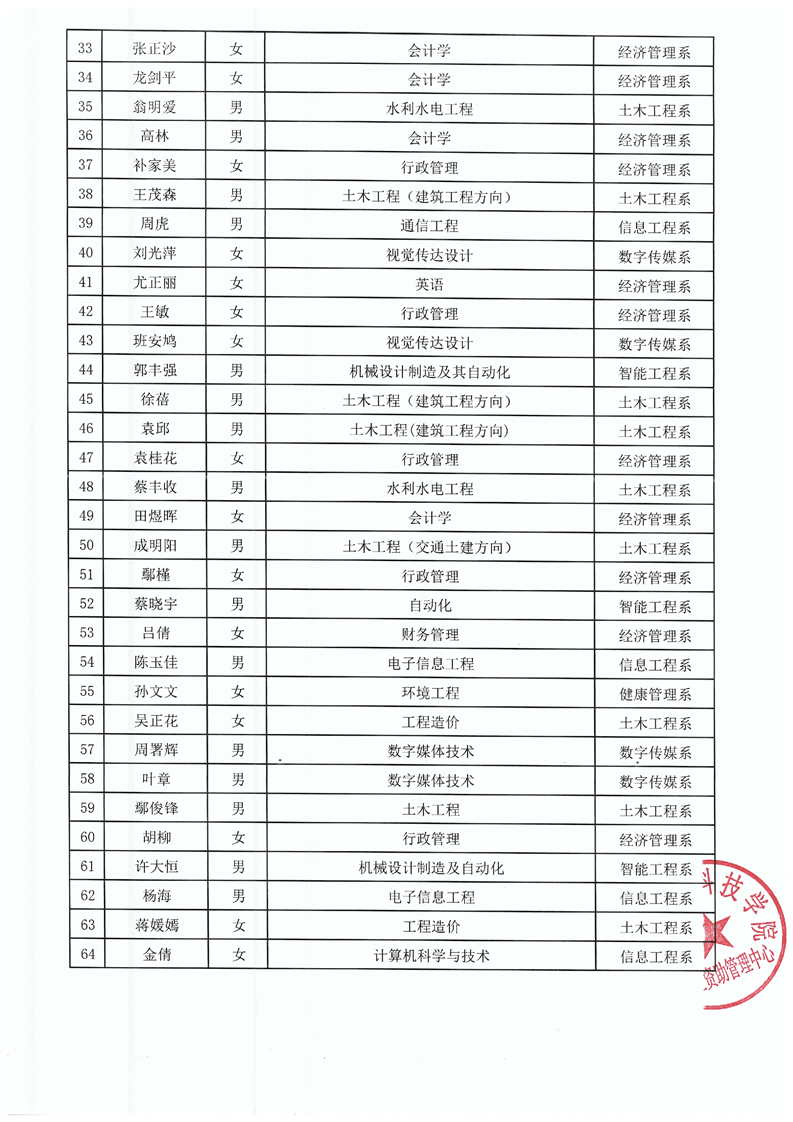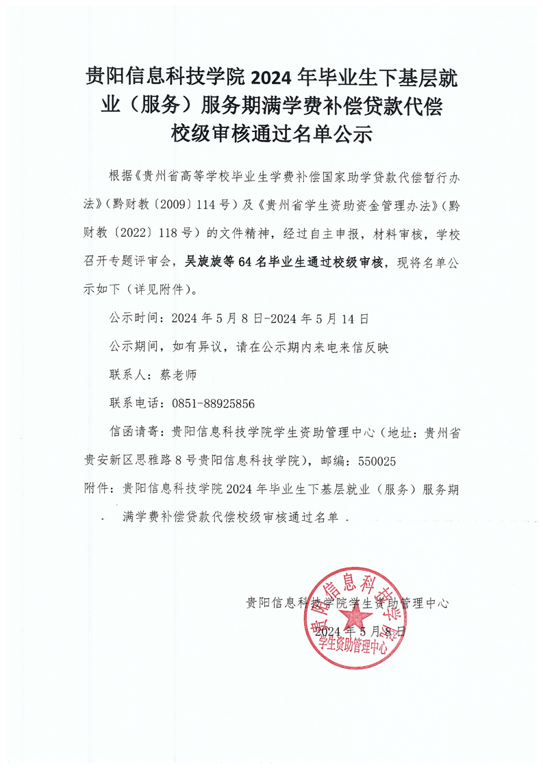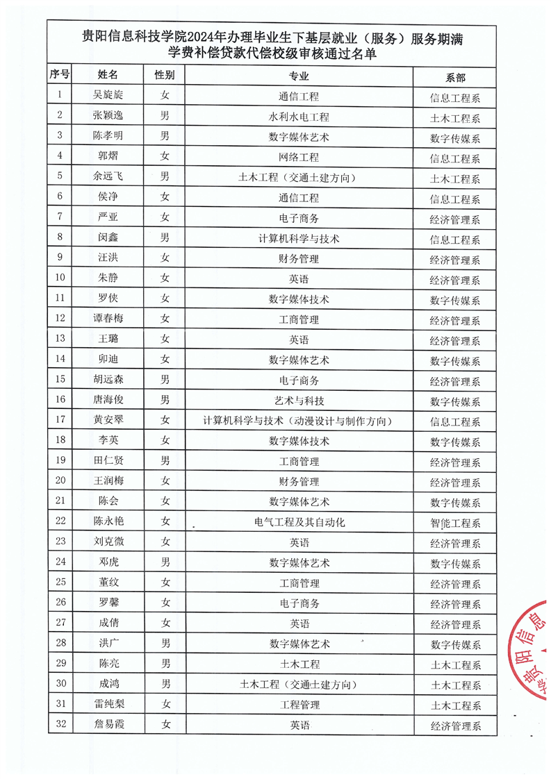 yabo鸭脖官网2024年毕业生下基层就业(服务)服务期满学费补偿贷款代偿校级审核通过名单公示