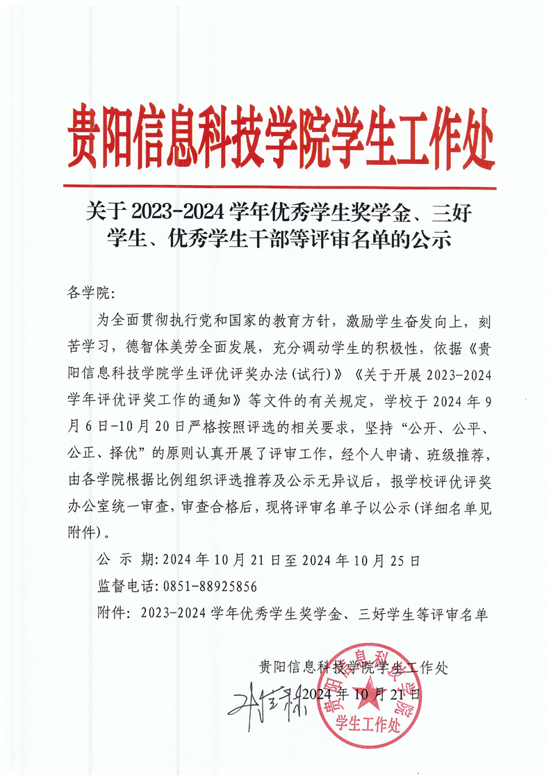 yabo鸭脖官网关于2024年贵州省普通高等学校三好学生、优秀学生干部、先进班集体拟推荐名单的公示