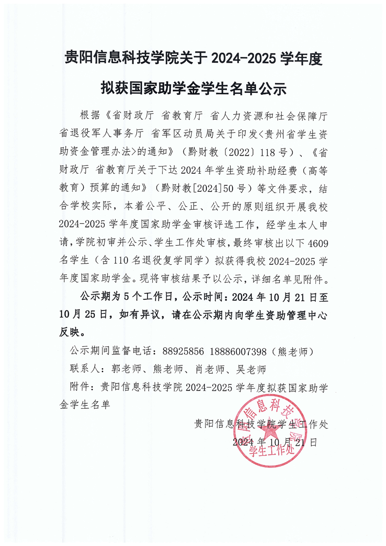 【贵科院学工发〔2024〕37号】关于做好2024-2025学年国家助学金评审工作的通知