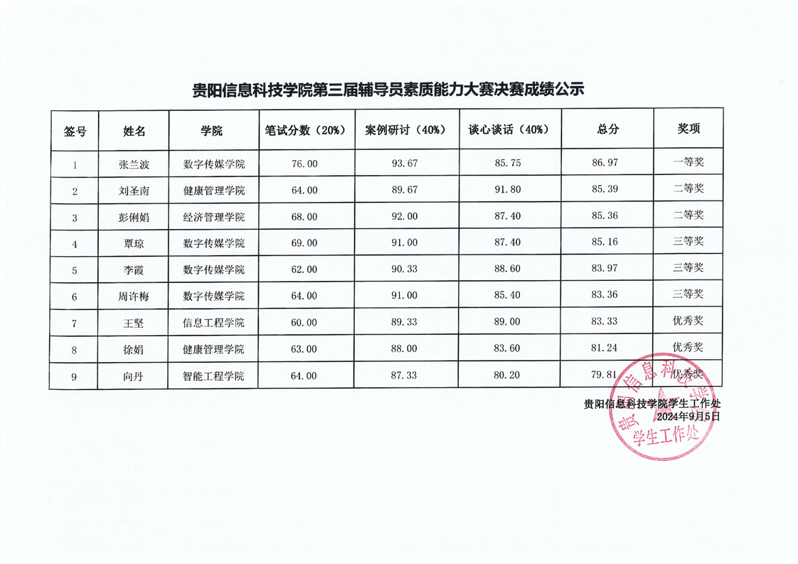 yabo鸭脖官网第四届辅导员素质能力大赛总成绩公示