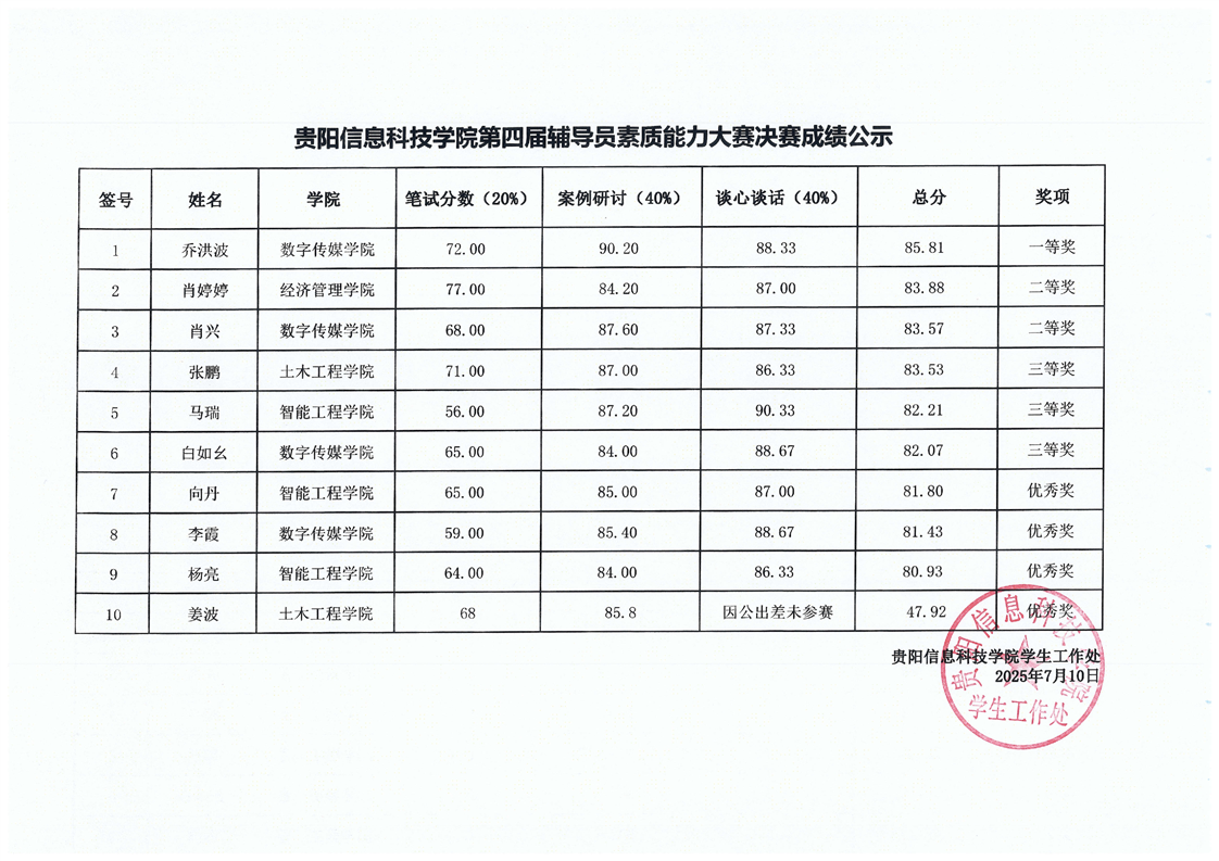 yabo鸭脖官网第四届辅导员素质能力大赛总成绩公示