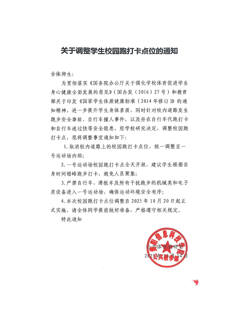 关于调整学生校园跑打卡点位的通知