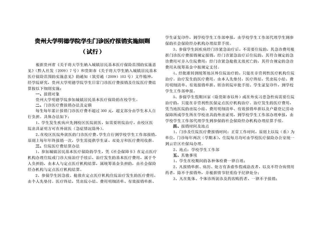 贵州大学明德学院学生门诊医疗报销实施细则